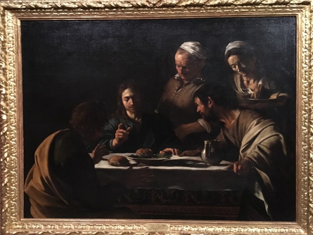 The Pinacoteca di Brera is the serious gallery of paintings in Milan established in 1809, by request of Mary Therese of Austria. Later, at the direction of Napoleon, the collection became a museum with the intention to show the most important paintings plundered by the French Army, paintings from the churches and monasteries of Lombardy were added to the collection, as were other confiscated paintings. At the heart of the Brera is a towering glass enclosed laboratory where the public can watch as master works are meticulously restored and repaired. Paintings as high as 6m are mounted vertically and the restorer sits in a comfortable work station, traversing the painting on a sort of gantry. They have only one painting by Caravaggio, but it is the brilliant Supper at Emmaus depicting the moment when the resurrected but incognito Jesus reveals himself to two of his disciples in the town of Emmaus only to soon vanish from their sight.