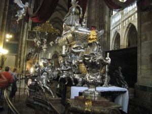 The main castle on the hill above Prague has world heritage status, being the largest castle complex in the world. Focal point of the site is the St Vitus Cathedral, big, gothic, stained black stonework outside, dark inside but rich with gold and silver deco. This is not yet high season, but the tourist queue at St V’s in particular was long and fast moving to shift the bus loads and bus loads of foreigners & school kids. The giddy limit of excess would have to be the tomb of St Jana (John) of Nepomuckeho all in solid silver, rising in layers of rococo twiddly bits to the coffin about 4m above the floor, all protected against assault from above by dusty rich red draperies supported very high above by four huge bulbous silver cherubs. Bell tower has 276 steps and worth the grind for the peek at the bells, the view – nothing higher in the whole city, and the great agricultural sort of clock mechanism. The cathedral has been a long time, some 600 years, in construction, to be completed as recently as 1920. As a finishing touch, a modern “gold door” was installed only three years ago. Crypt closed today, but lots of dead kings there. Other features of the complex include the old royal palace, the Basilica, and many palaces that have been taken over by the police or army in less monarchist times. Over the years since the Russians moved out the damage has been progressively repaired.