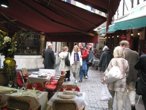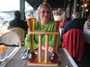 It seems that every second shop is a chocolaterie, but there are also many lace shops. Cheap lace can be found in the street markets, but is coarse and uneven, made in Asian sweat-shops. The boutiques sell many forms of lace, hand made in Belgium including Bruge ‘bobbin lace’ made with many tiny bobbins and so so fine and precise. Given the skill, hours of work and detail of the fine lace, the price is more reasonable than the cheap imported item. Can’t quite escape the feeling that there may also be Belgian workshops that are not completely “fair trade”. The Hot chocolate varies from OK to superb, and with the cup comes a large sugar bowl. By comparison with Australian taste, even the beer is sweet. One of the street cafes had an inviting €14 three course lunch menu. Sweetiepie had Herring Rollmops and steak, I had soup and Flemish style Rabbit.