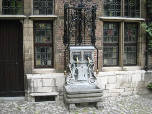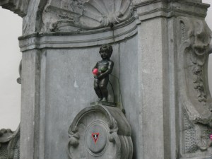 A crime to visit Brussels without paying homage to Manneken Pis, but were surprised to see the diminutive stature of the little chap. It is said that in 1142, the troops of the two-year-old Duke Godfrey III of Leuven were battling against the troops of the Berthouts, the lords of Grimbergen. The troops put the infant lord in a basket and hung the basket in a tree to encourage them. From there, the boy urinated on the troops of the Berthouts, who eventually lost the battle. Another legend claims that in the 14th century, Brussels was under siege by a foreign power. The city had held its ground for some time, so the attackers conceived of a plan to place explosive charges at the city walls. A little boy named Julianske happened to be spying on them as they were preparing. He urinated on the burning fuse and thus saved the city. Yet another was that a small boy went missing from his mother when shopping in the centre of the city. The woman, panic-stricken by the loss of her child, called upon everyone she came across, including the mayor of the city. A city-wide search began and when at last the child was found, he was urinating on the corner of a small street. The story was passed down over time and the statue erected as tribute. The statue is dressed in costume several times each week from a wardrobe consisting of several hundred different costumes.