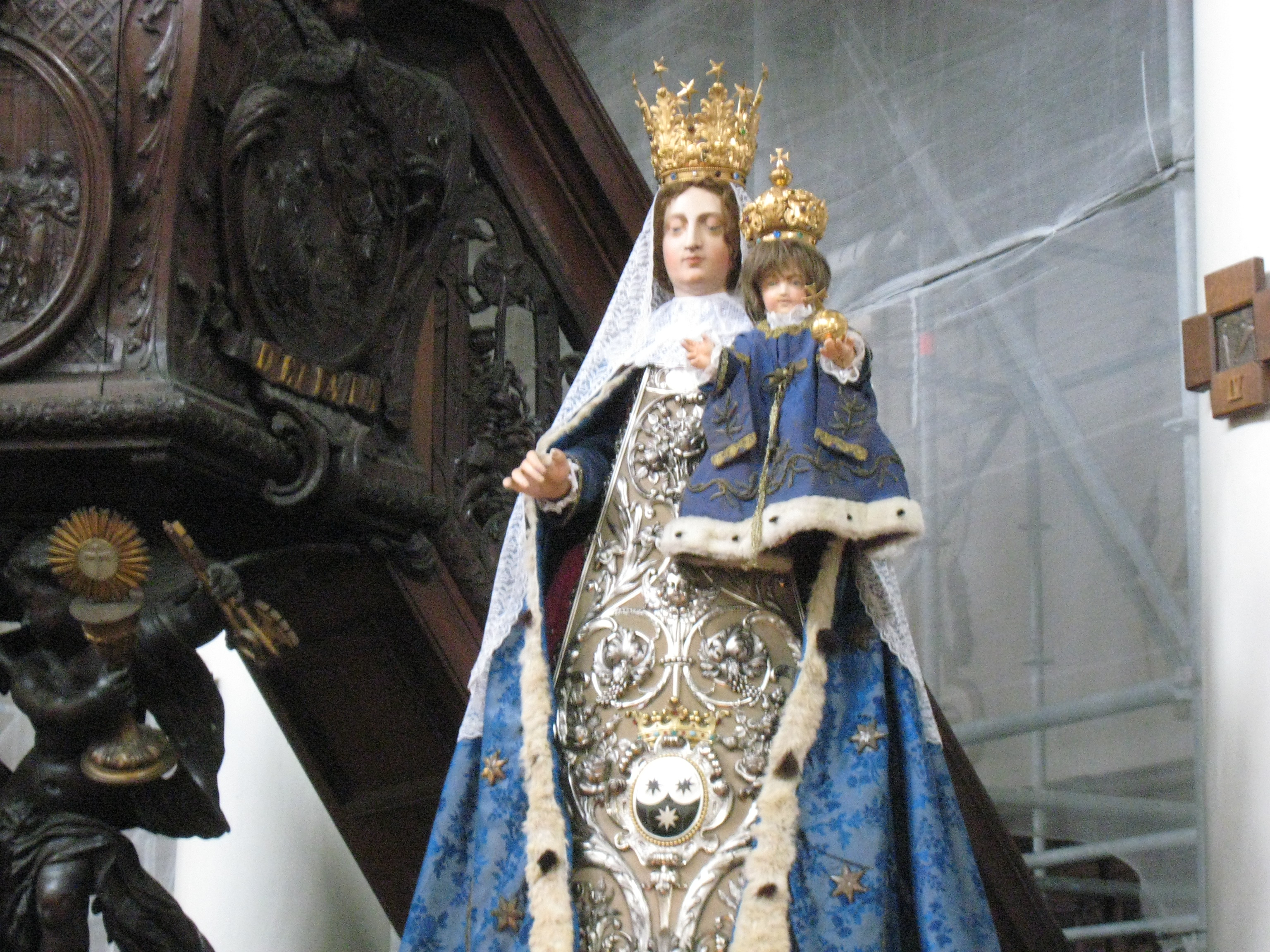 The Rubens house was a gem of another order. Hardly any of his own works on show, an early Adam and Eve, but alas no well upholstered ladies, but some work off his associates and employees could be seen. The house was out of the families hands a generation after his death. Only recently the state has taken it over and turned it into a museum filled with the sort of furniture and ornament that appeared in his paintings, much of it looking just like a real life 3D painting of the period. In the 17th century Rubens and his team painted frescos on the walls and barrel vaulted ceiling of the St Charles Borromeus church nearby. A fire in the church in the 18th century destroyed all of the work of Rubens. The restoration includes the statue of a finely arrayed Madonna holding aloft the infant dressed as a king. Was somehow reminded of another well dressed statue of an infant on the other side of the country.