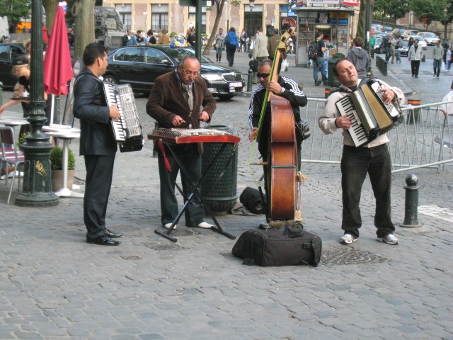 Occasional music on the streets as well. Gypsy band playing outside the St Hubert Galleries arcade had two accordions, hammered dulcimer played wildly by a hunched little old man with white shoes, and a great sound from a crappy old double bass. The double bass was a work of art. Strung with only three strings of the luminous brush cutter variety, and having an under carriage of taped–on wheely bin wheels for easy mobility. They were giving joy to a small audience and harm to no one when a team of four police moved in for the kill. The lead muso protested that they were causing no disturbance. The head honcho in blue quietly said ‘move’. And the wheels of the double bass were rolling.