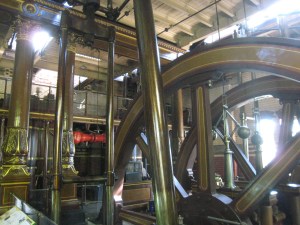 The Abbey Pumping Station Museum in Leicester had a free open day, so, attracted by the tall chimney and old machines in the yard, we peeped in the gate to see what was pumped and to where. Sewage. This was where the waste of the city was pumped up-hill to a distant processing plant in Beaumont Leys, So? How to make an interesting museum of that? For a start, there are the three story high beam engine pumps, steam powered from the coal fired boiler house with its tall tall chimney. The four steam engines were built in Leicester by Gimson and Company and today are rare examples of Woolf compound rotative beam engines. Rated at 200 hp, at 12–19 rpm, they pumped 208,000 imperial gallons of sewage an hour. Well how ’bout that? Three of the four engines have been restored back to working condition. Then there is the collection of vintage chamber pots, a collection of old flushing toilets. There was an interesting cutaway section of a complete toilet system, seat, bowl, S bends, drains and connectors to other toilets, all with simulated contents. Needless to say the little guys were fascinated and had to be discouraged from hands-on investigation from the outlet end. Little boys. Funnily enough, the functioning toilets of the museum were outdoors, had a vintage brass plaque, but were functionally disappointingly boring. Rest of the show was well worth the entry price. Interesting that the tall old chimney faintly suggested a space rocket, because over the road was…
