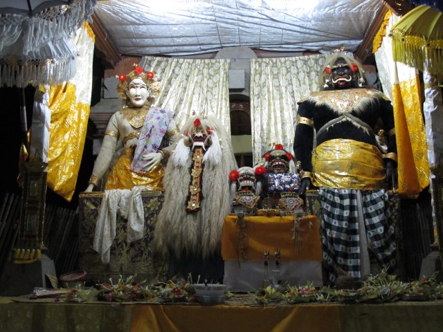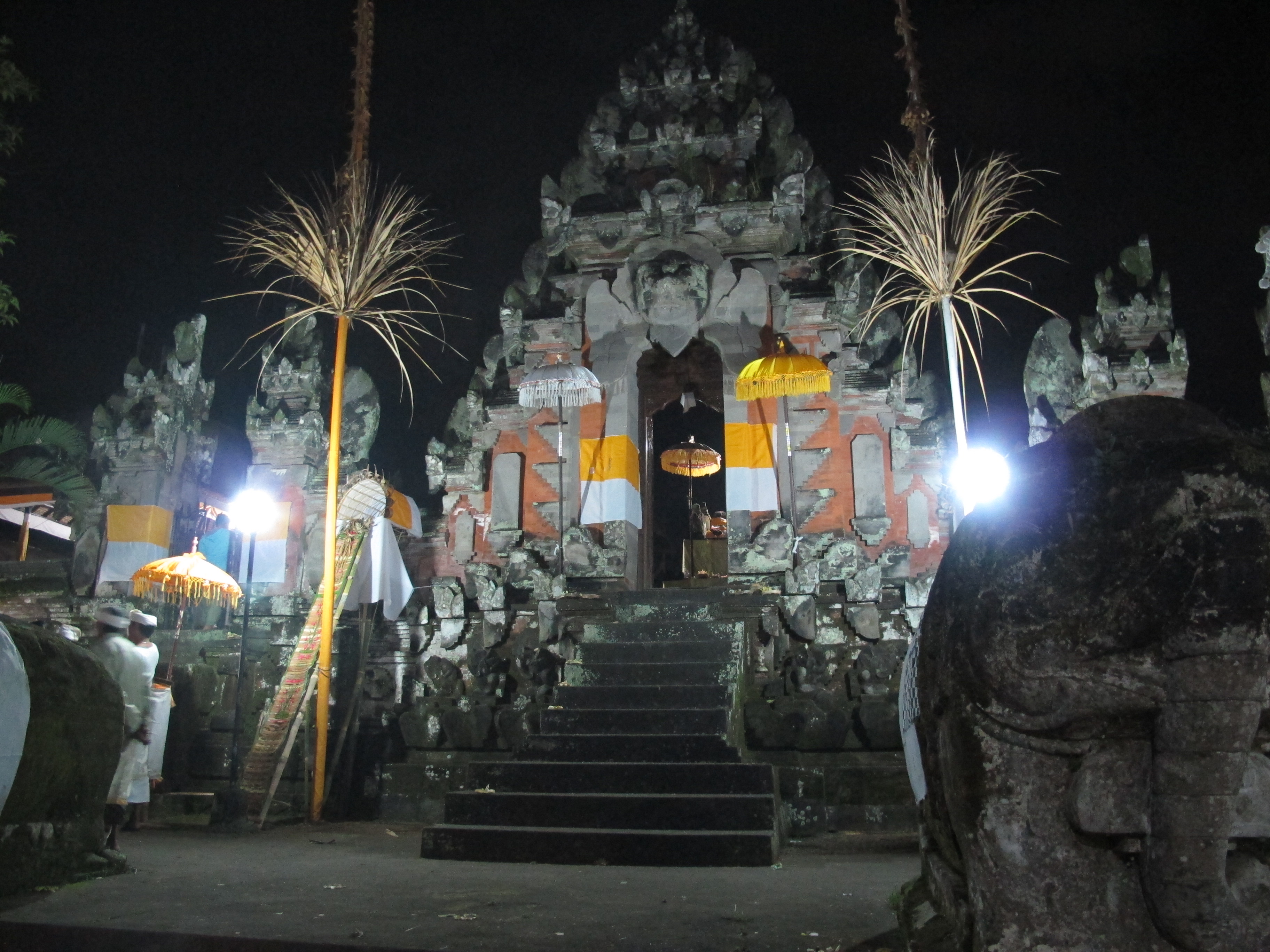 Anyway, this week has been the anniversary of one of Wayan’s village temples. After 5 days of cleaning and dressing the temple and deities, the anniversary celebrations continue for a further 5 days. Wayan had us properly kitted out, with the blokey special double sarong, sash and headgear, and took us to the third night of action.