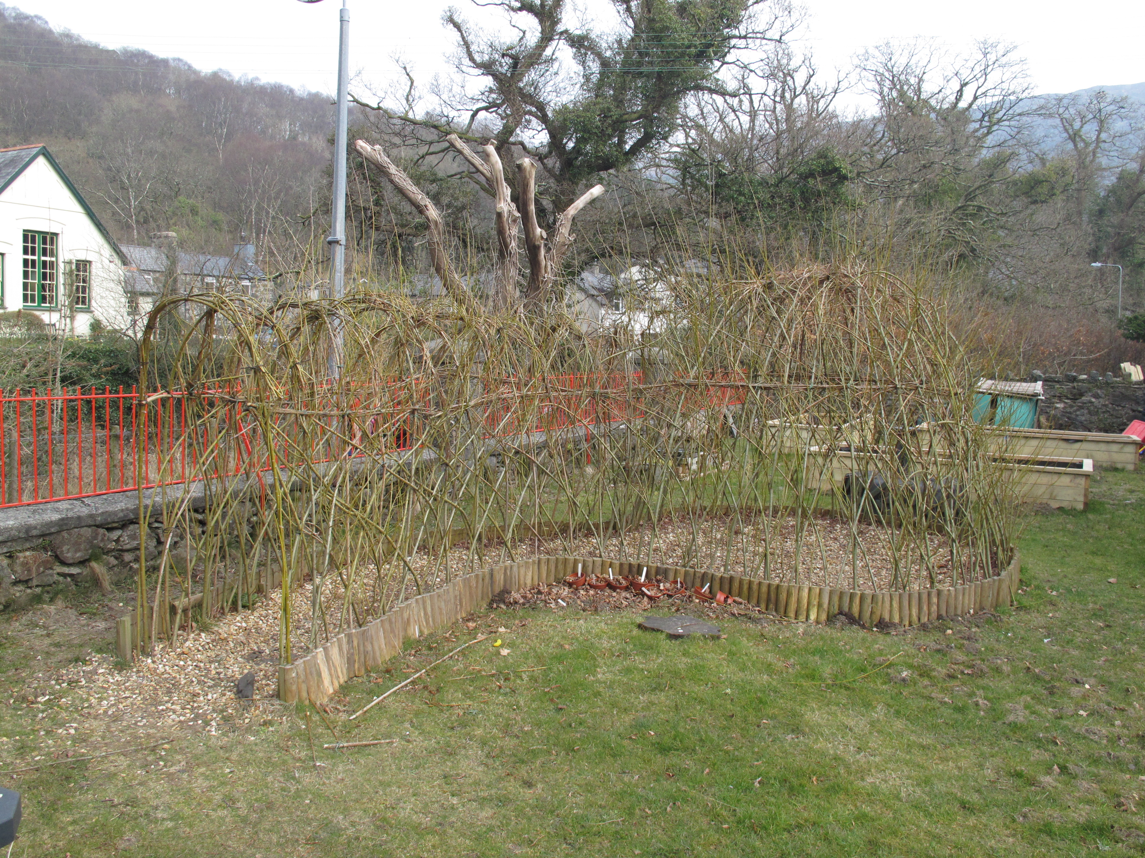At our cottage in Nantlle a living fence has been made by cleverly planting and weaving long thin willow trigs – obviously looks good later in the spring and summer. Also in the village of Nantlle there is a retreat and conference centre called Trigonos. When we visited, uninvited, there was a silent retreat on the seventh of its eight day program, so the only information that we gained was from its website. They have also been doing living willow architecture, this time an igloo with a long winding entry tunnel.