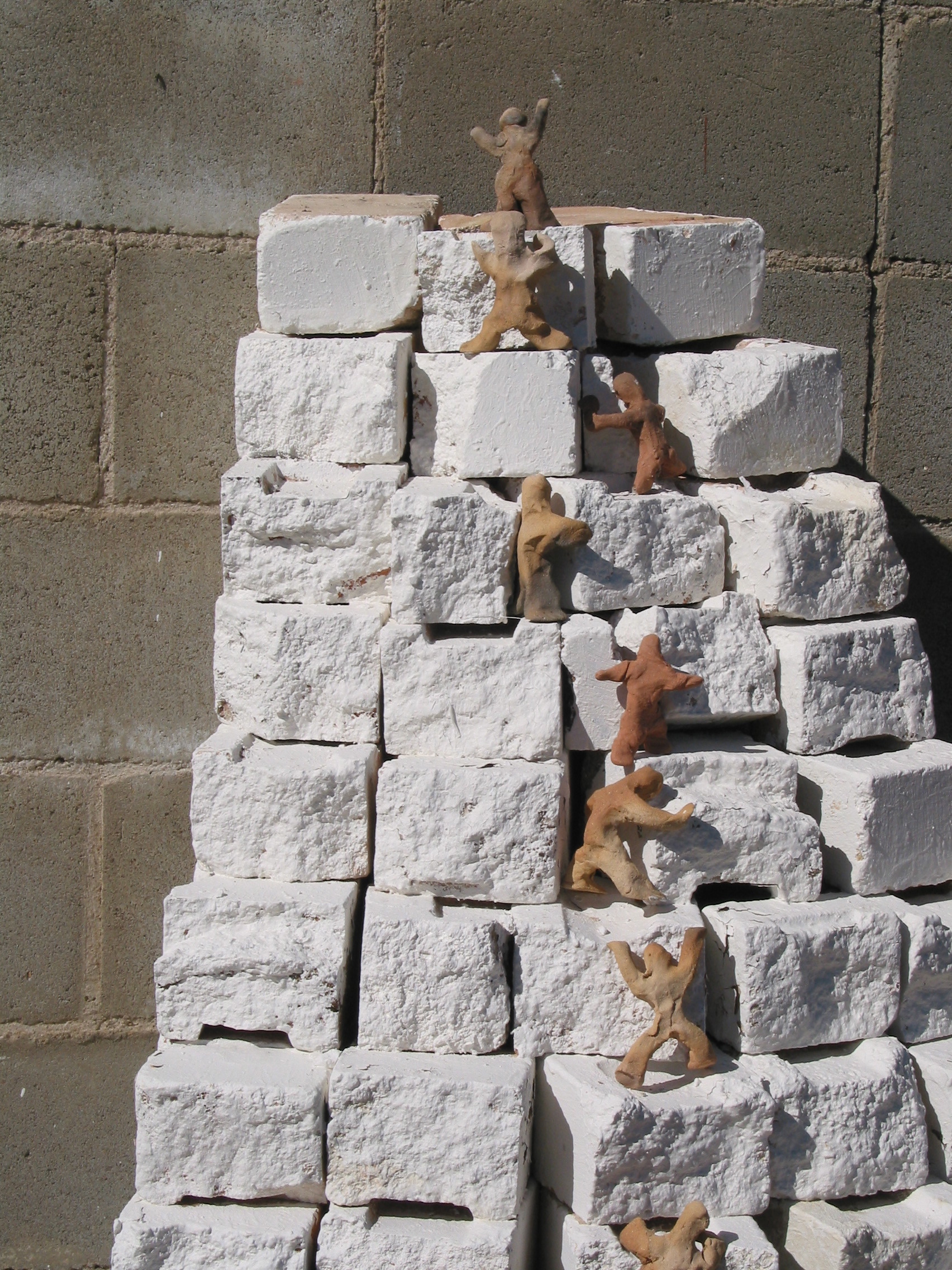To fire the figurines, his spectacular party trick was a portable continuous feed kiln. The freshly made soft clay models were instantly placed on the conveyor belt. They progressed from cold to glowing orange heat and then plunged into cold water only 40 minutes later. As a teaching device this kiln gave instant insight and understanding of the ceramic process, dramatically showing what is actually involved in changing soft fabricated clay into a durable, more or less weatherproof product. Over two days the innocent bystanders made a few hundred figures variously running, walking, jumping but mainly standing still. These were then arranged ascending the pyramid.