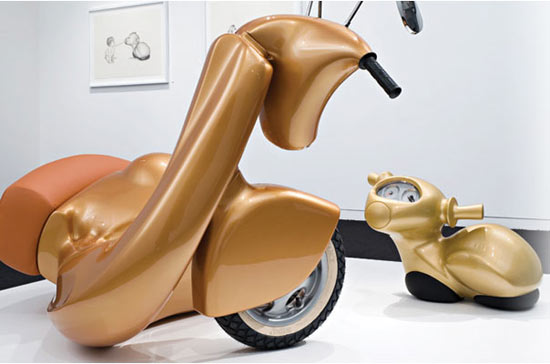 Just as useless as the white library is the ultimate fat cat’s fat car. The over inflated red Porche was the work of Austrian Erwin Wurm. It is said that a real Porche is housed somewhere inside, underneath all of the fat. So over-inflated that not even the tiniest child could fit behind the wheel. Clearly, the other end of the spectrum from Patricia Piccinini’s cute and cuddly bendy motor scooters.