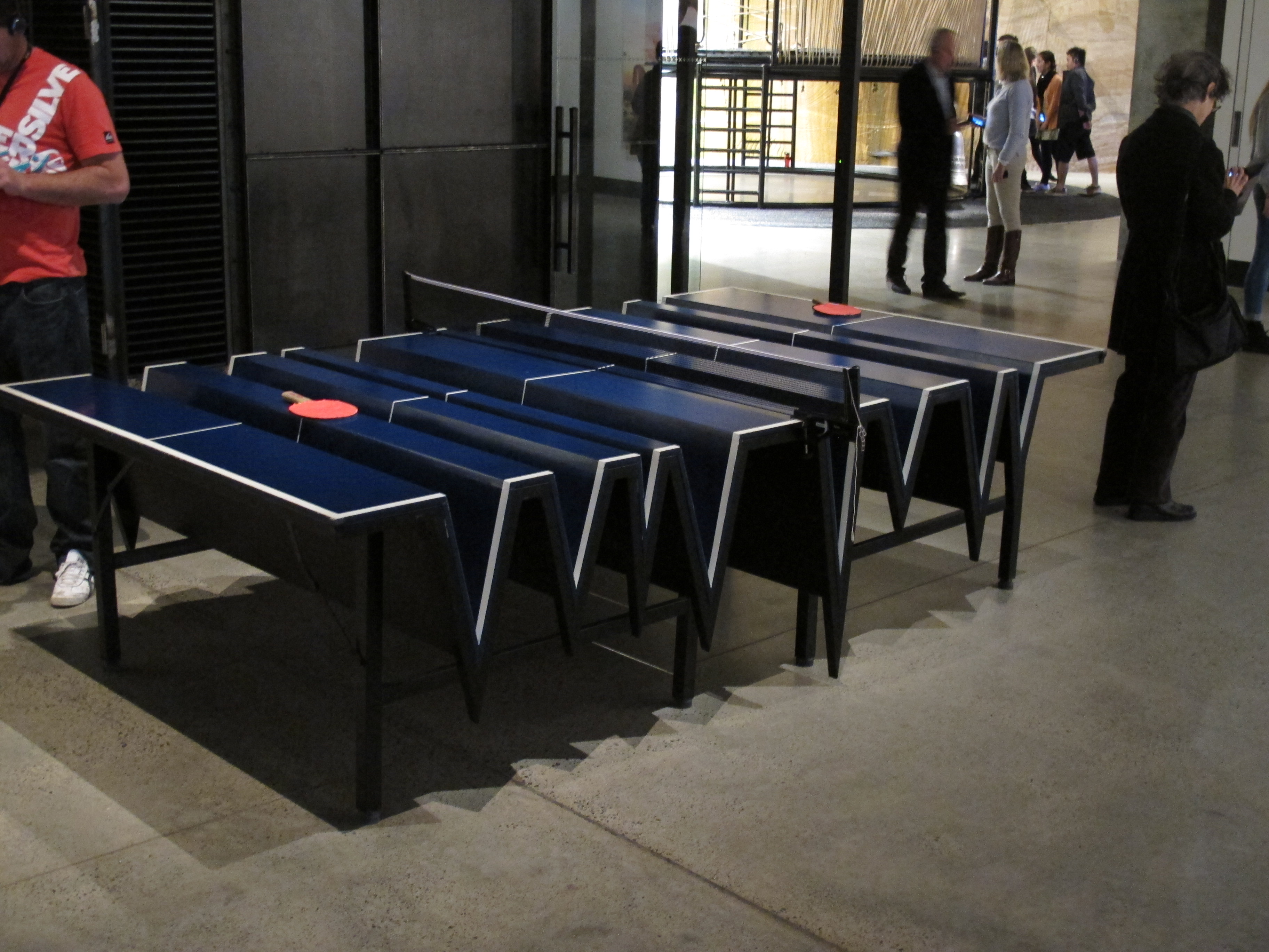 Ultimately, people assemble unlikely works of art because they can. And they are art simply because someone is prepared to display them. Whether good or bad art, who is to say? Another unlikely work of art is a table tennis table that patrons are invited to use. The trick is that the table has deep lateral grooves. Most of the time the table plays absolutely true, but about a quarter of the time the table swallows the ball. Not sure how the scoring works.