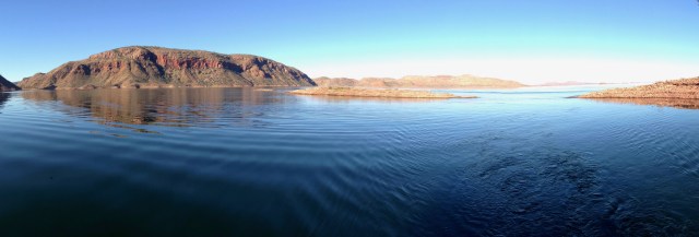 Lake Argyle is another of those bigger than big features. 18 times the size of Sydney harbour – 70 times, if it ever fills to capacity, and disappearing way over the horizon. Captain Matt took us on a tour of the freshies, the rock wallabies, the seven spotted archer fish and the sunset, lubricated by the sparkling. The original Durack homestead was doomed to be 30 m under water when the Ord was flooded to provide water for irrigation and hydroelectricity. The building was relocated stone by stone and now stands on higher ground as the Durack museum. Much more remarkable than the relocation is the quality of stone masonry that was done way back then in such primitive conditions. It is said that there is still historic stuff down there, even a toothbrush in the outhouse bathroom.