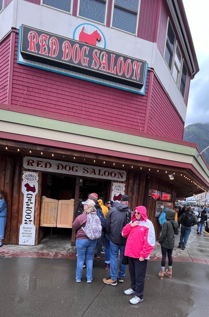 At Juneau, four cruise ships discharge about 8000 tourists ashore. The horde of customers of the infamous Red Dog Saloon spills out on to the street, along with the gravel voiced singing of the piano player. No hope of access to a shot of their signature poison as recommended by Don Lymer. Great recreation of the gold rush. Pity about us tourists.