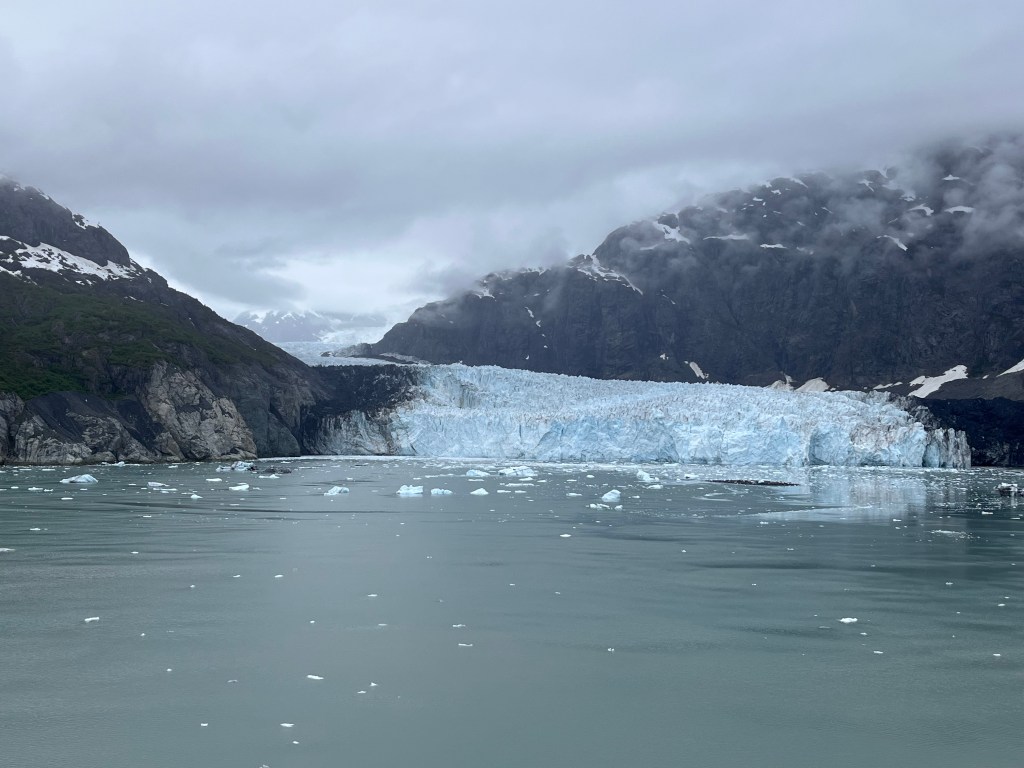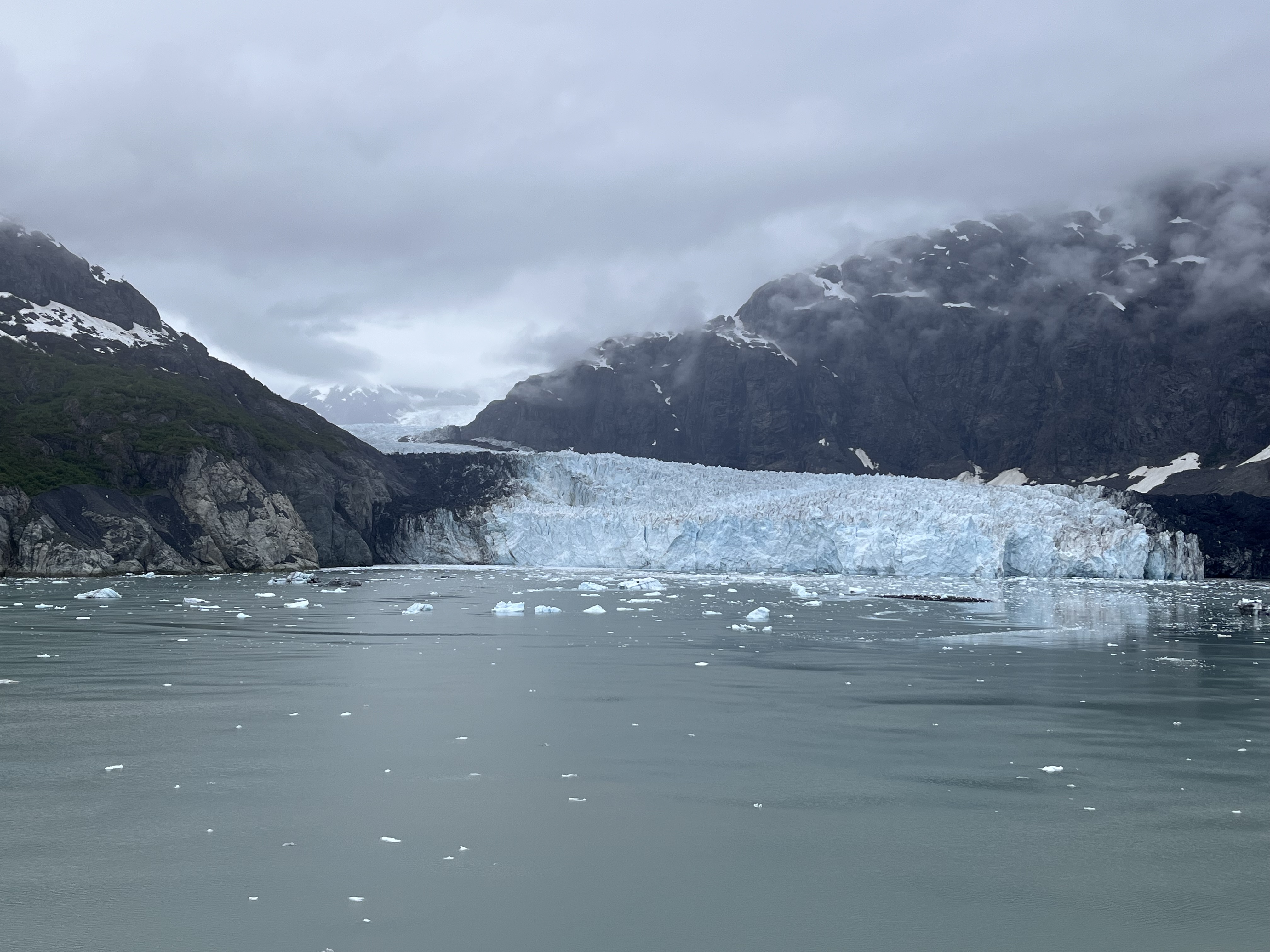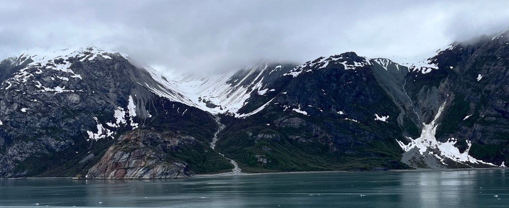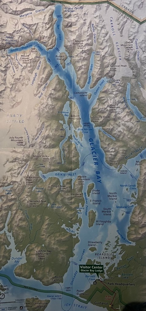This is a map of Glacier Bay. Today the only two significant glaciers draining into the bay are The Lamplugh and The Margerie. Both at the top end of the map. In the year 1780 the whole of glacier bay was one big glacier. By 1860 permanent ice had receded to half way up the bay. The remains, along with most of the Arctic ice are disappearing fast. Catch it while you can.